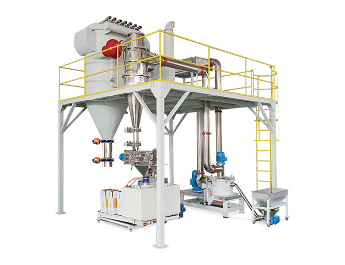 ACM系列磨粉系統(tǒng)ACM系列微粉粉碎系統(tǒng)由空氣分級(jí)磨、旋風(fēng)分離器、旋轉(zhuǎn)篩或者振動(dòng)篩、超細(xì)粉集塵箱和高壓風(fēng)機(jī)構(gòu)成。具有高速破碎、空氣分級(jí)、旋風(fēng)分離、篩分和超細(xì)粉收集等功能。通過(guò)調(diào)整運(yùn)行參數(shù)可以獲得理想的粒徑分布。ACM系列微粉粉碎系統(tǒng)也可以用于顏料、鈣粉、碳粉、藥品及食品的粉碎。